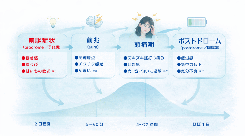現在の理解では、片頭痛発作は次のような流れで進むと考えられています。